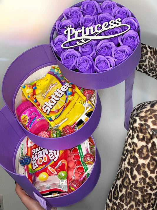 Pink Round Wooden Gift Box with Soap Roses & sweets – 30x30 cm