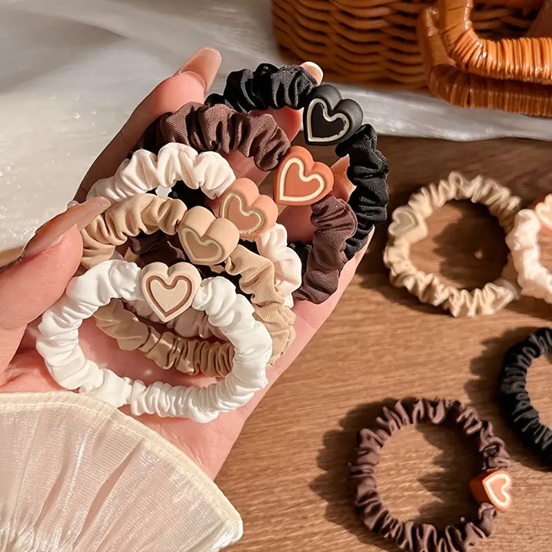 A set of 5 coffee-colored elastic hair ties with adorable love pendants and bowknot design. Perfect for adding charm to your hairstyle or as a thoughtful gift for women.