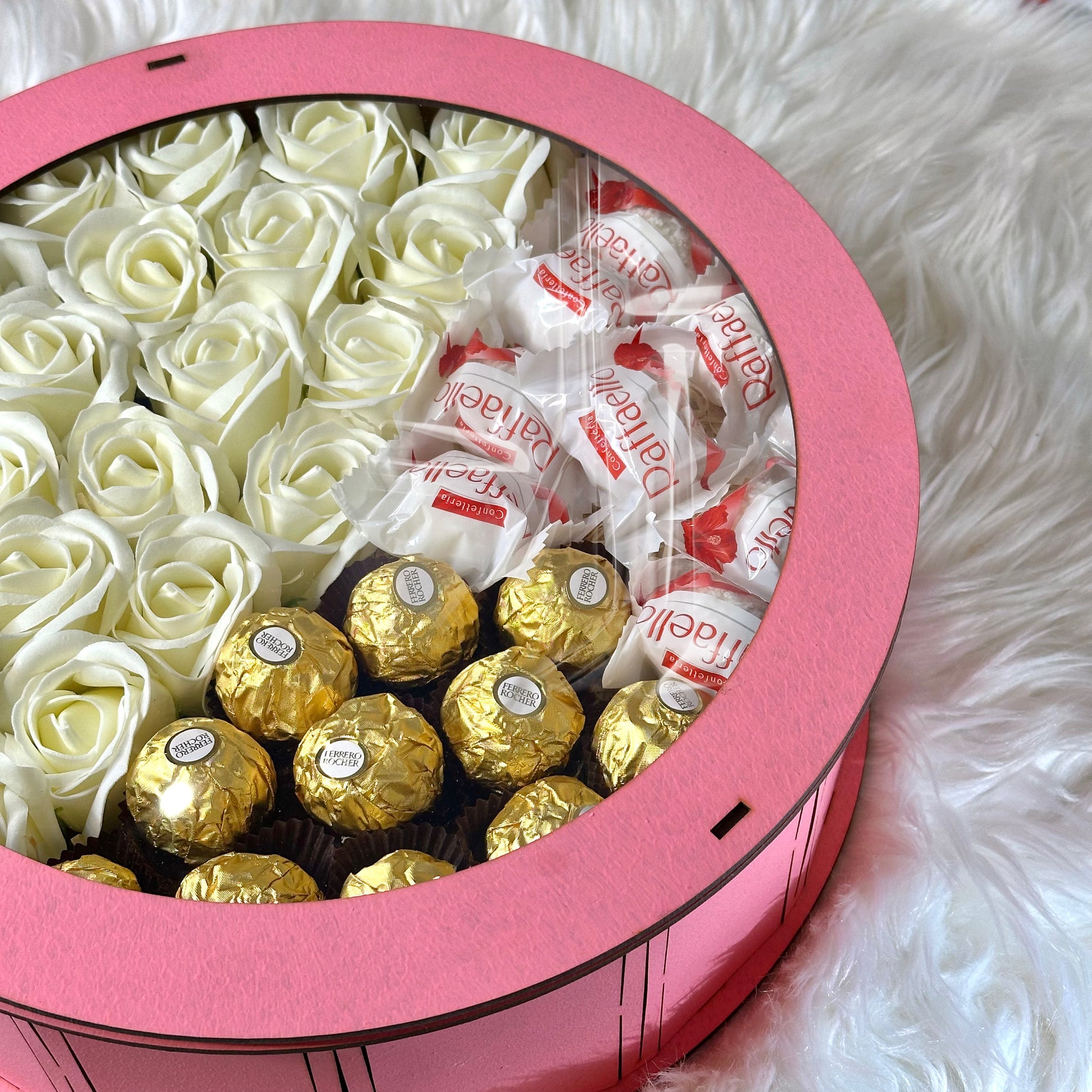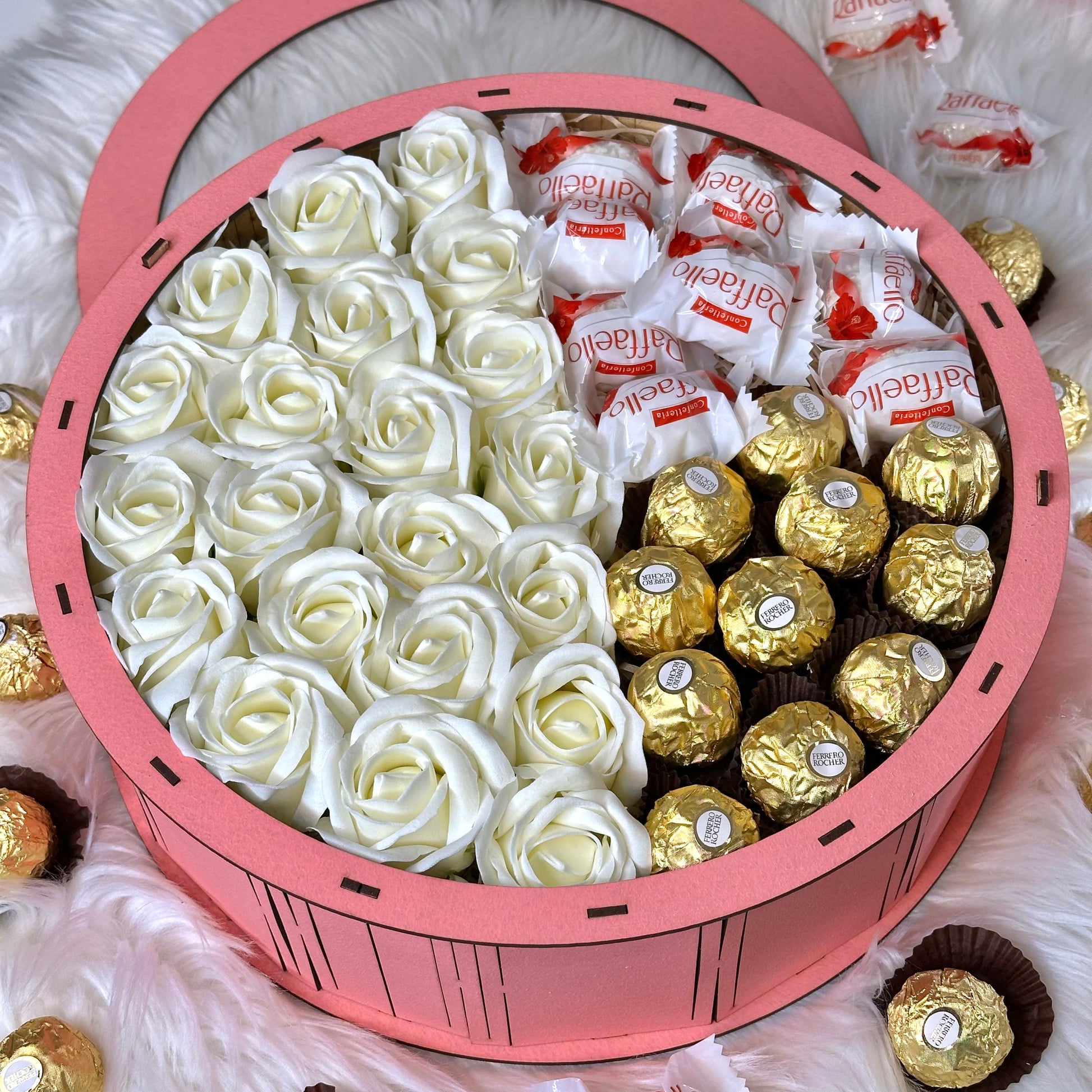 Make any moment extra special with this elegant pink round wooden gift box, beautifully filled with delicate soap roses and premium chocolates. Designed to impress, this handcrafted box is perfect for birthdays, anniversaries, Valentine’s Day, or simply to show your love and appreciation.