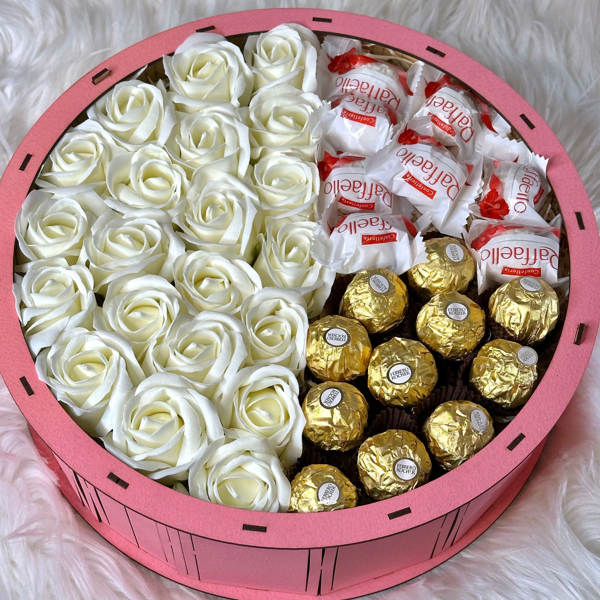 Pink Round Wooden Gift Box with Soap Roses & sweets – 30x30 cm