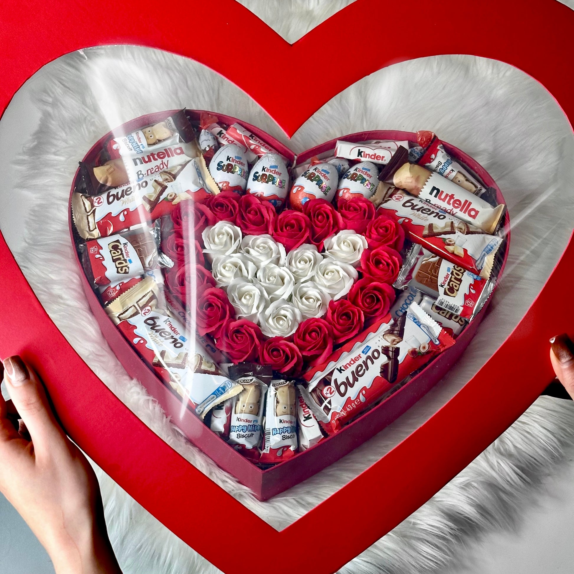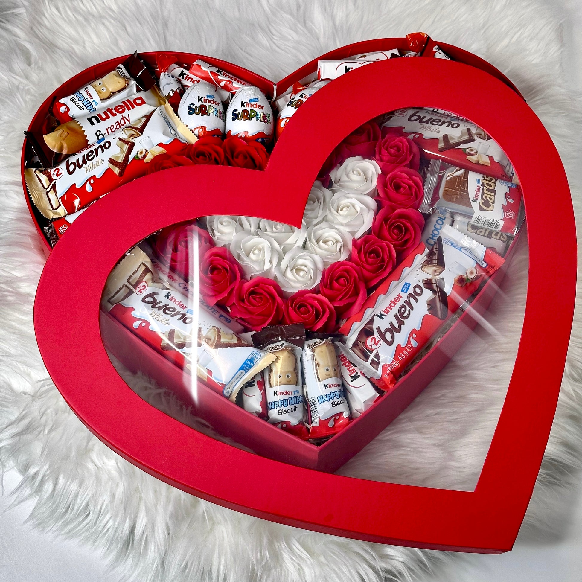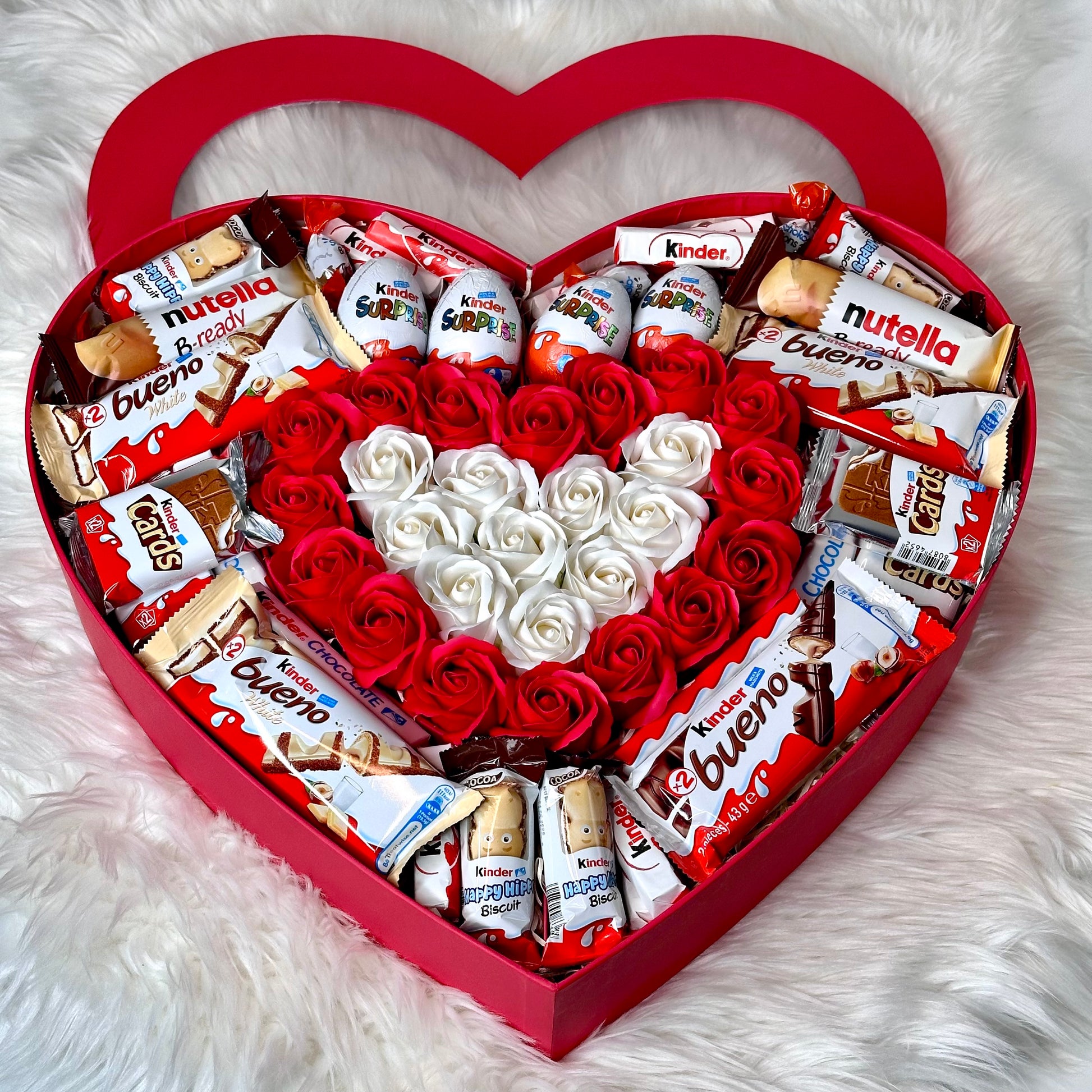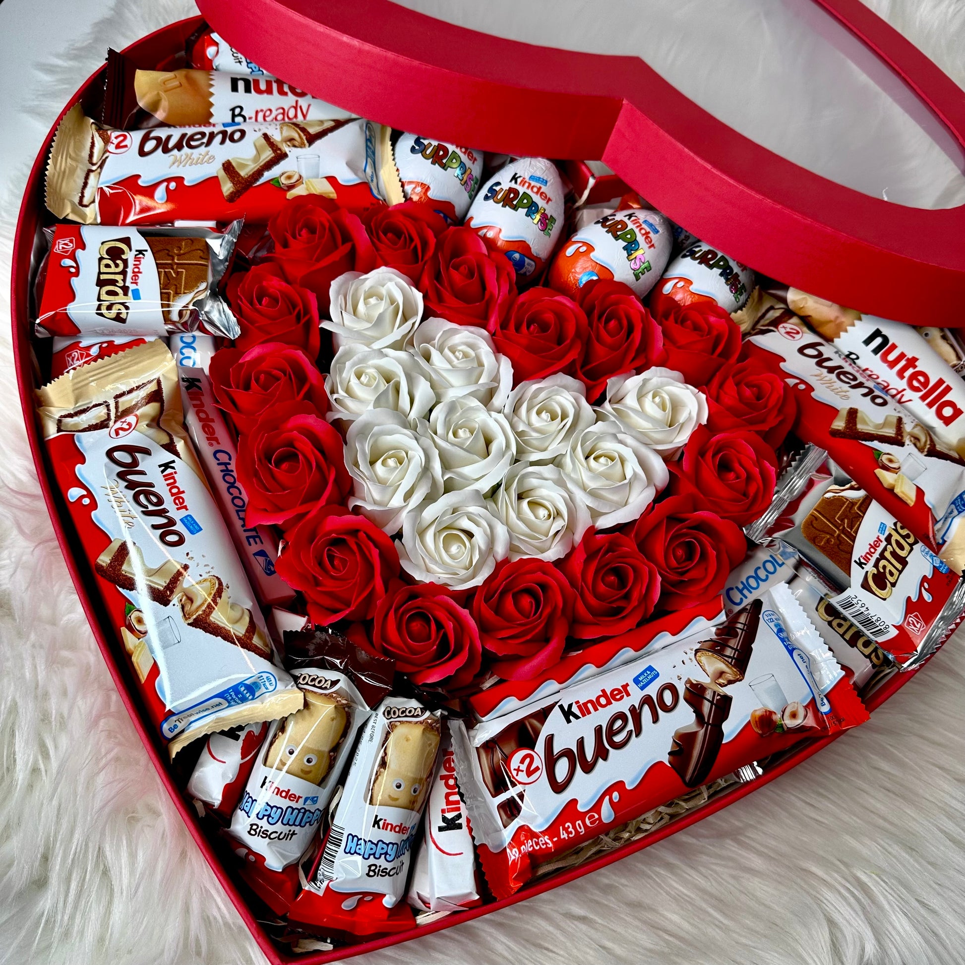 Immerse yourself in elegance and sweetness with our red heart-shaped gift box, which combines exquisite soap roses and delicious Kinder treats. Each item in the box is carefully selected to create the perfect gift.
