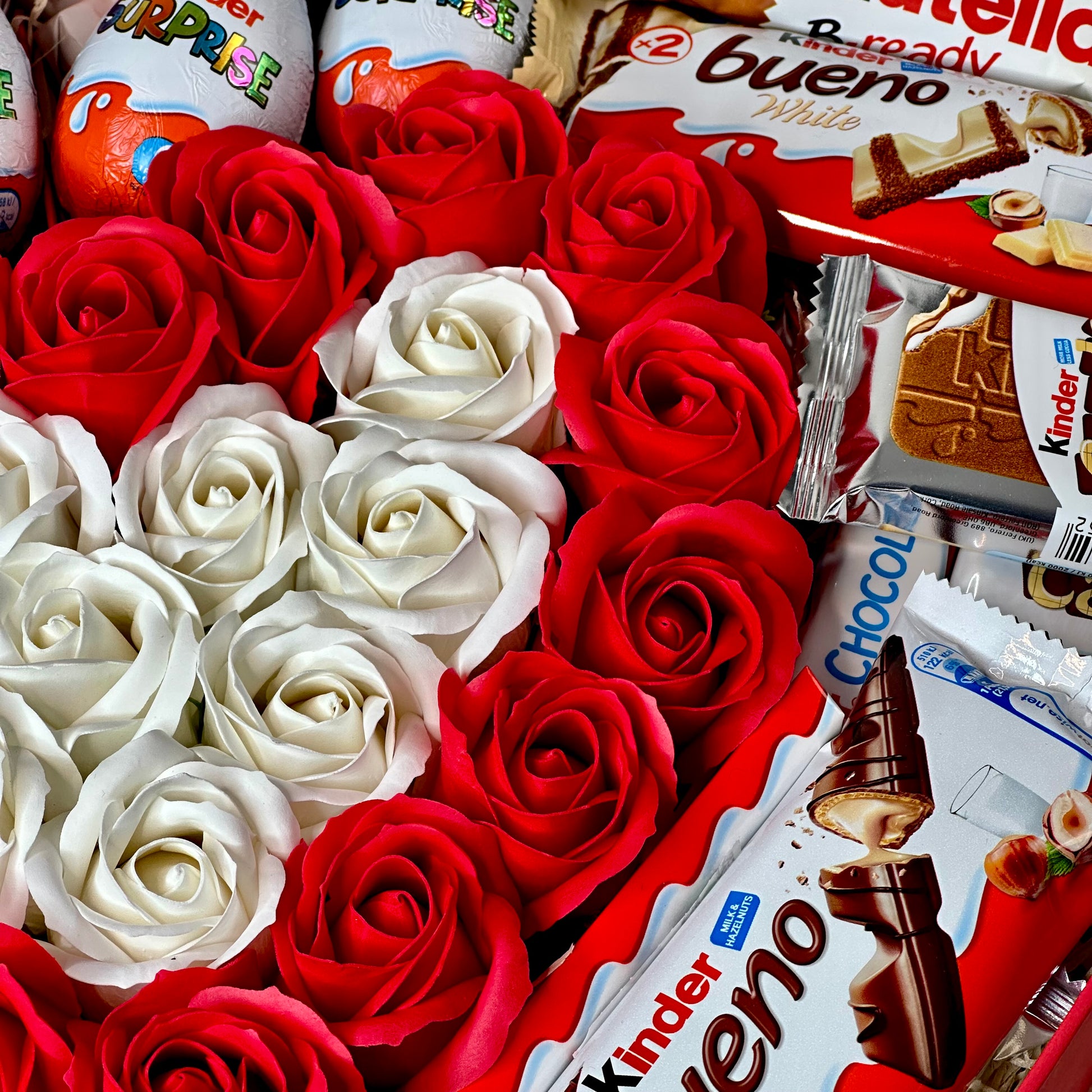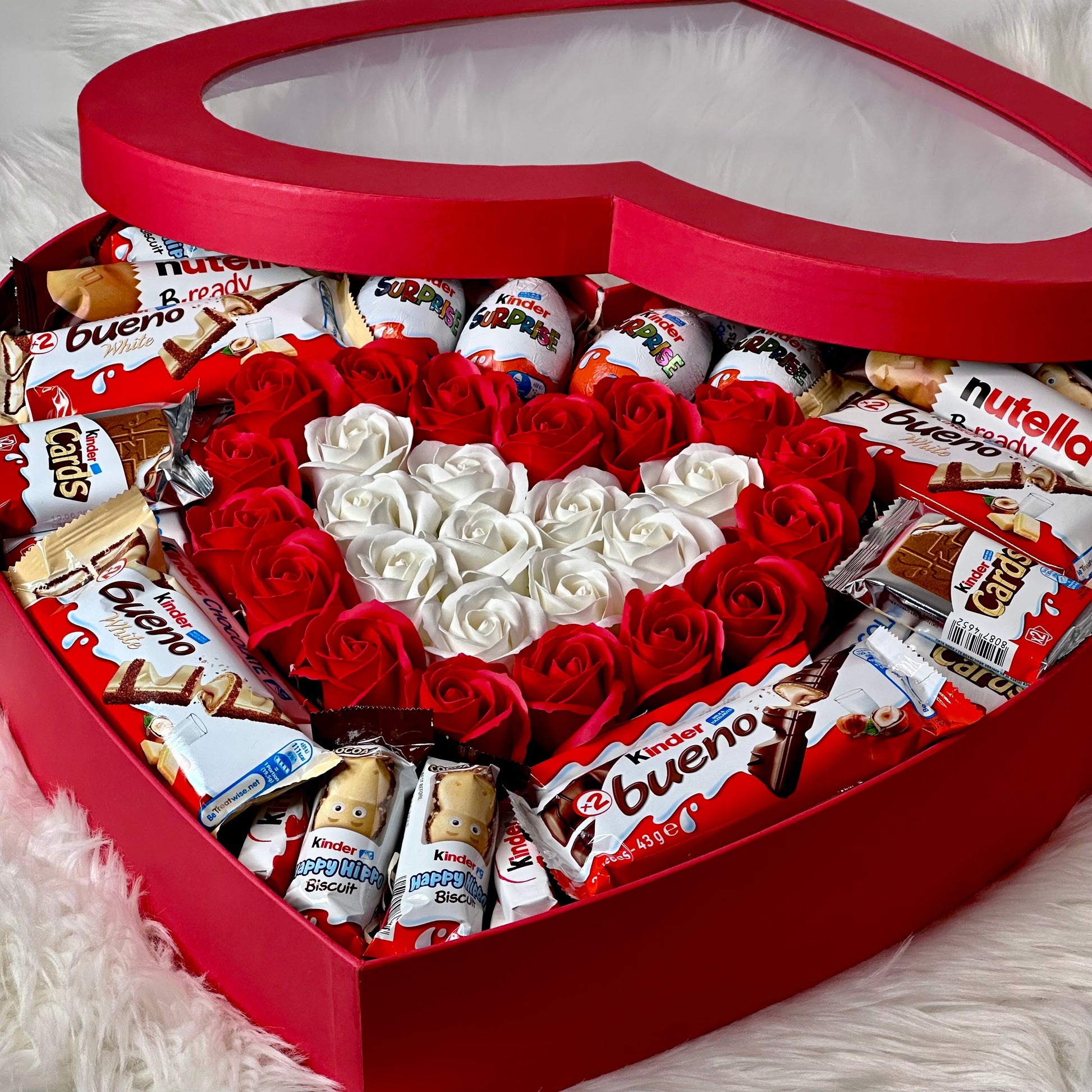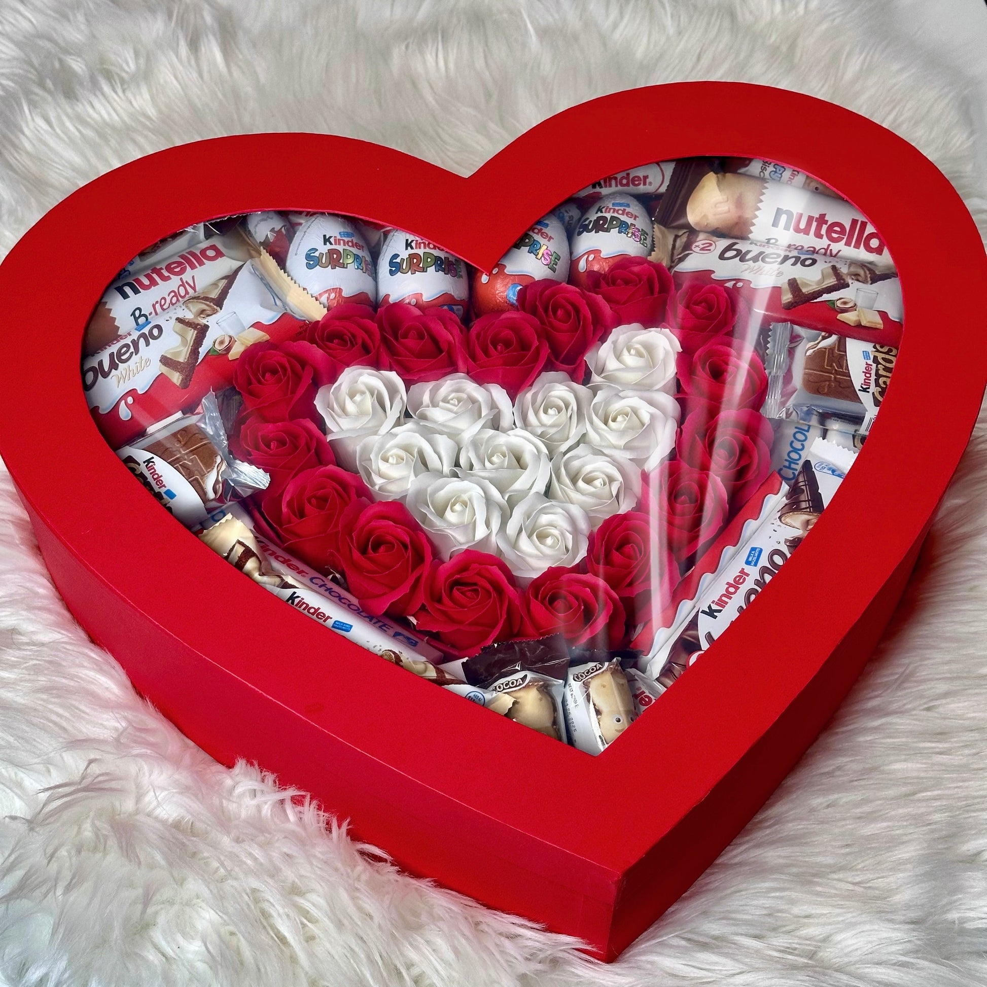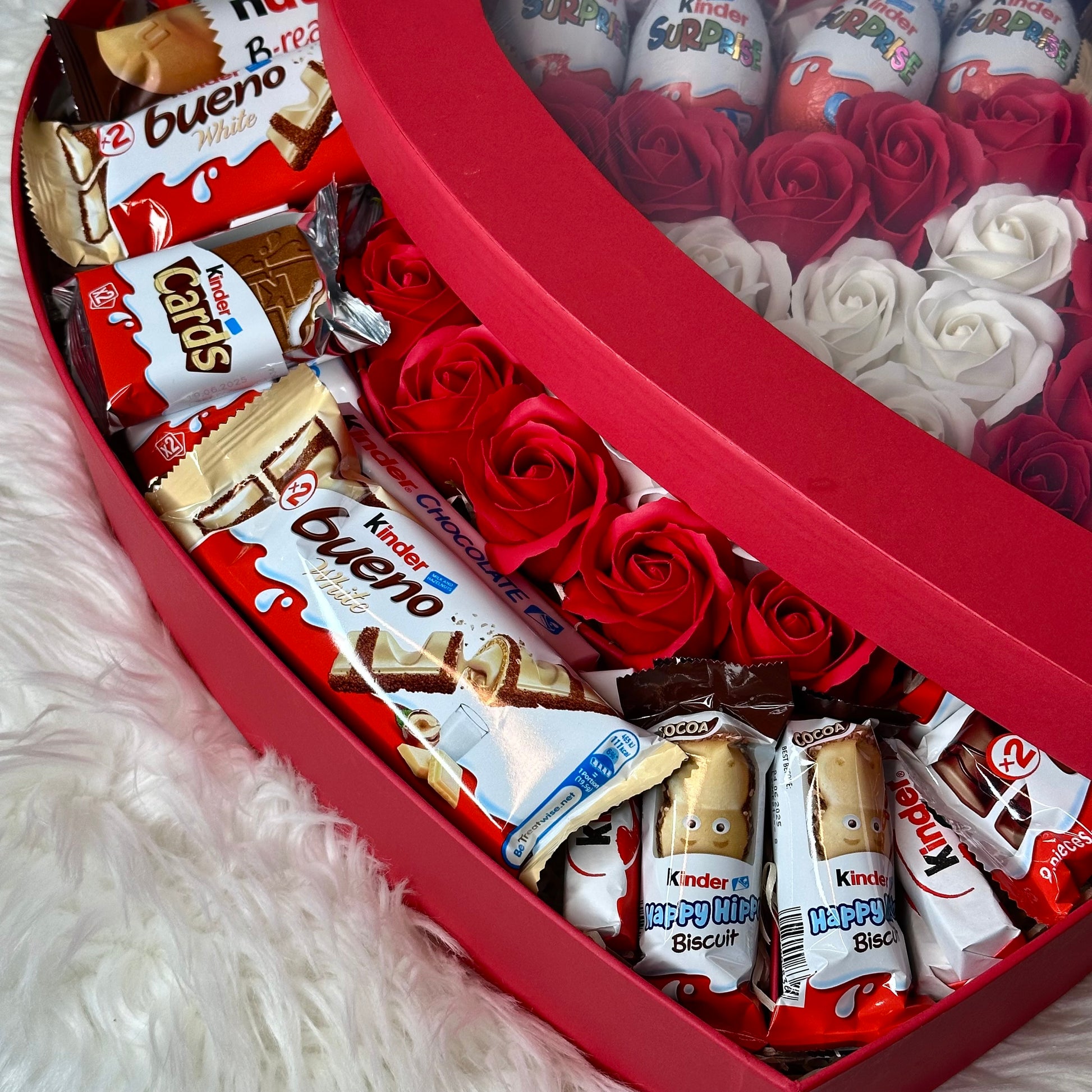 Immerse yourself in elegance and sweetness with our red heart-shaped gift box, which combines exquisite soap roses and delicious Kinder treats. Each item in the box is carefully selected to create the perfect gift.