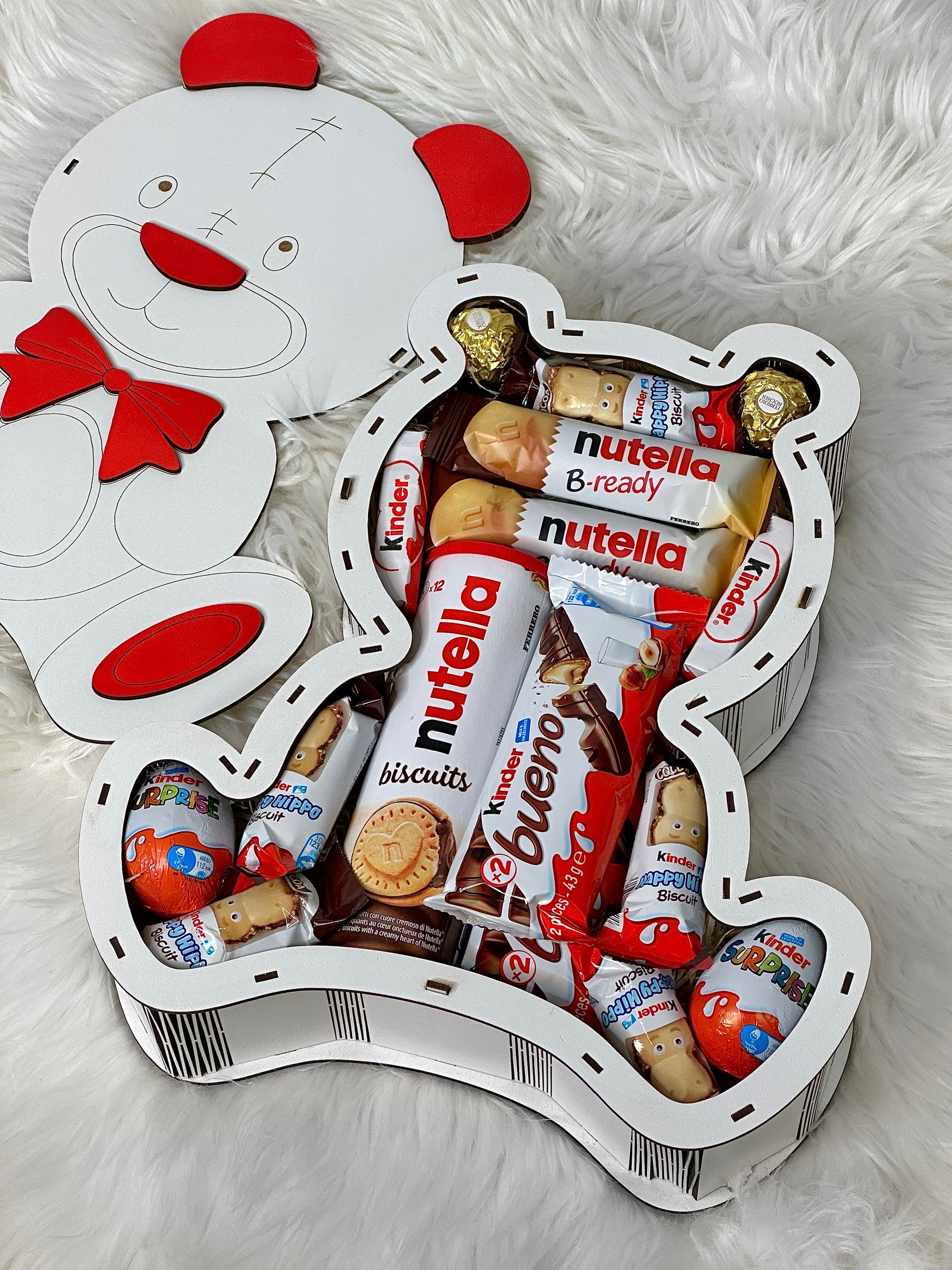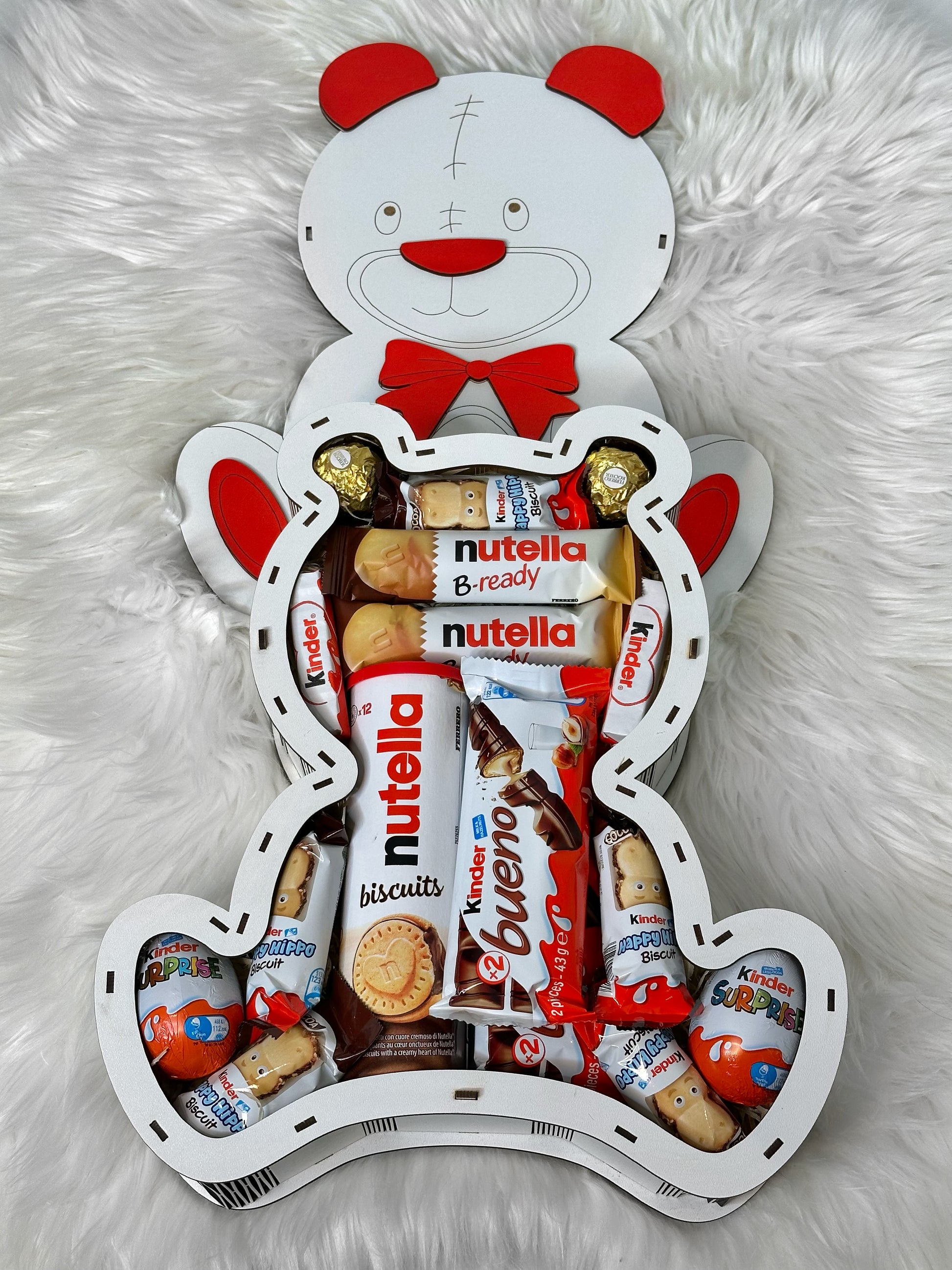 A charming wooden gift box in the shape of a teddy bear, filled with an irresistible selection of treats. Perfect for any occasion, this delightful box combines warmth, sweetness, and elegance.